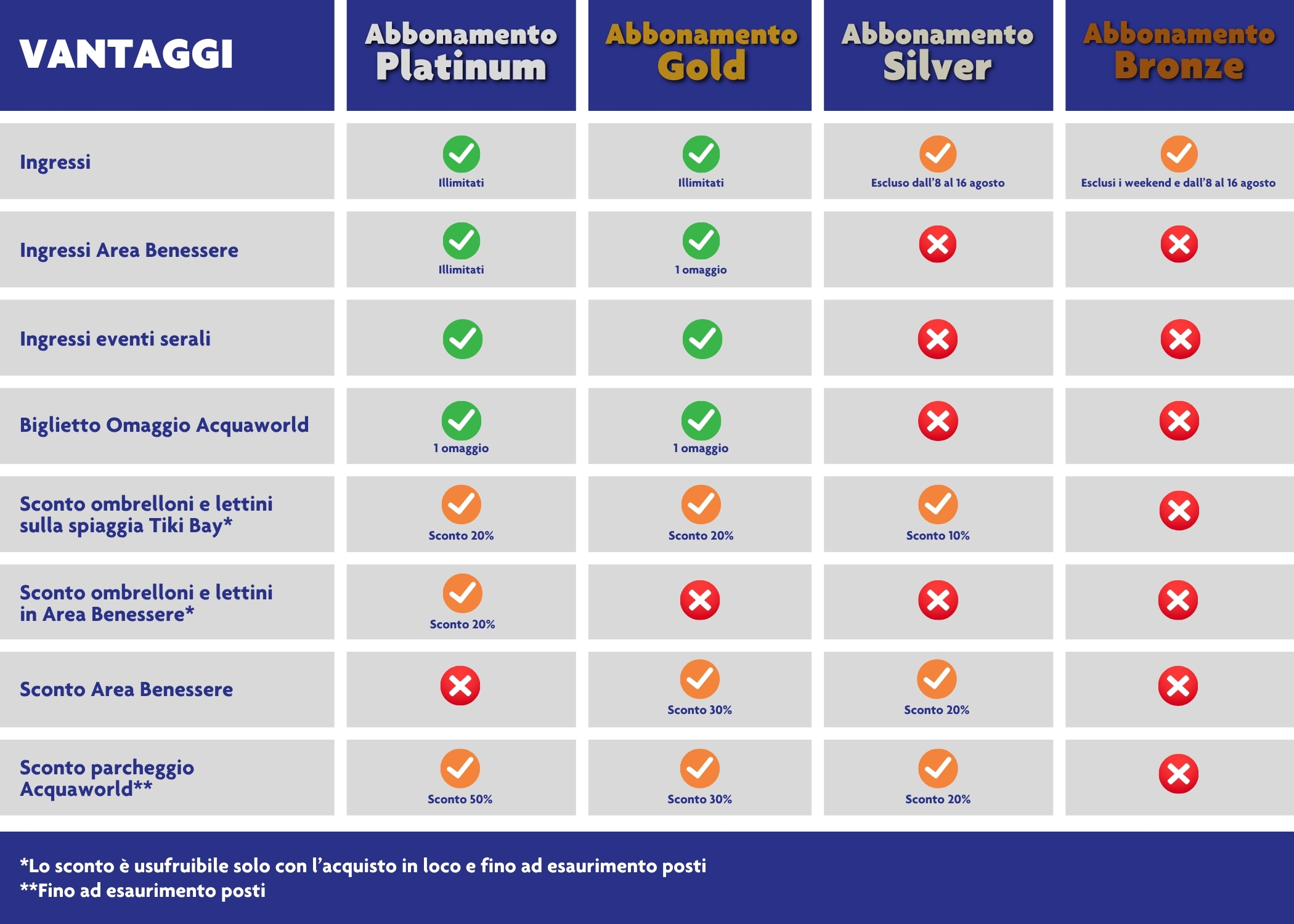 Gli abbonamenti sono nominativi e non sono rimborsabili. La validità degli abbonamenti non potrà essere modificata né estesa. Pic-nic CONSENTITO dal 30 maggio al 6 settembre.